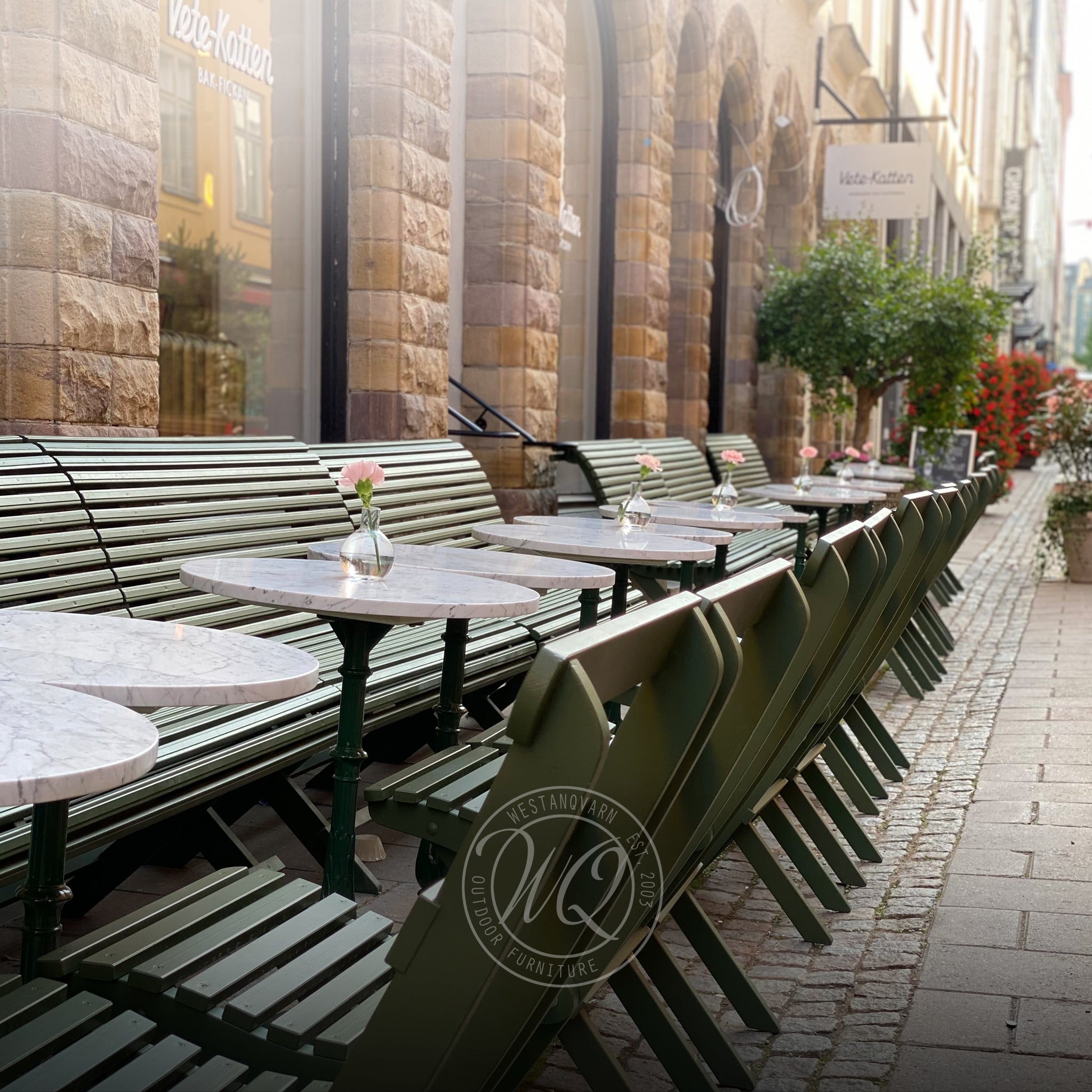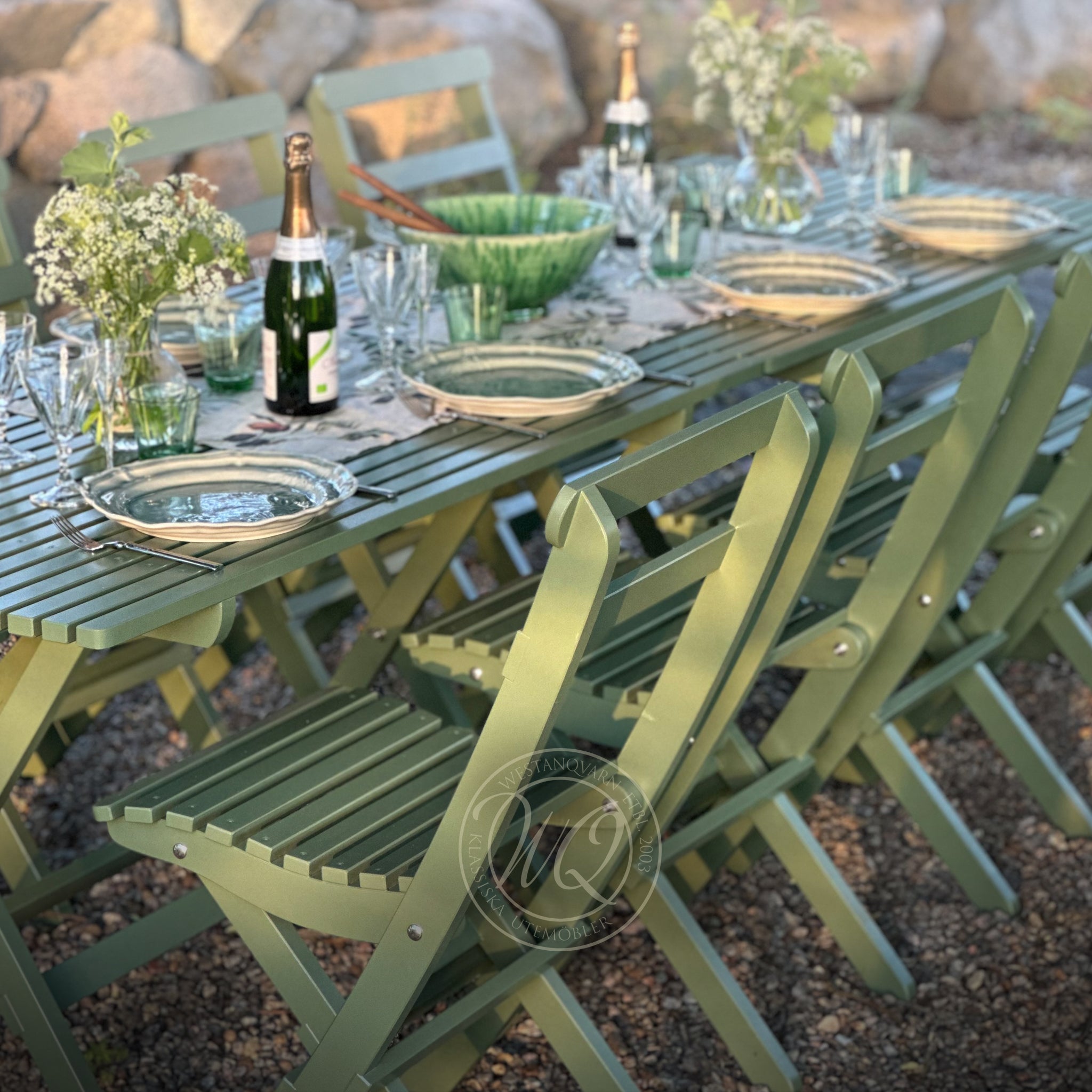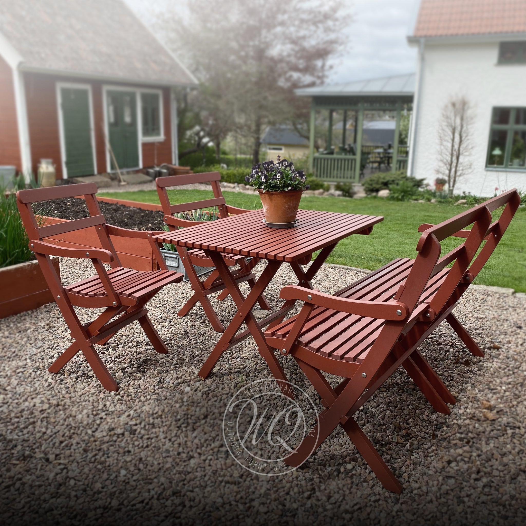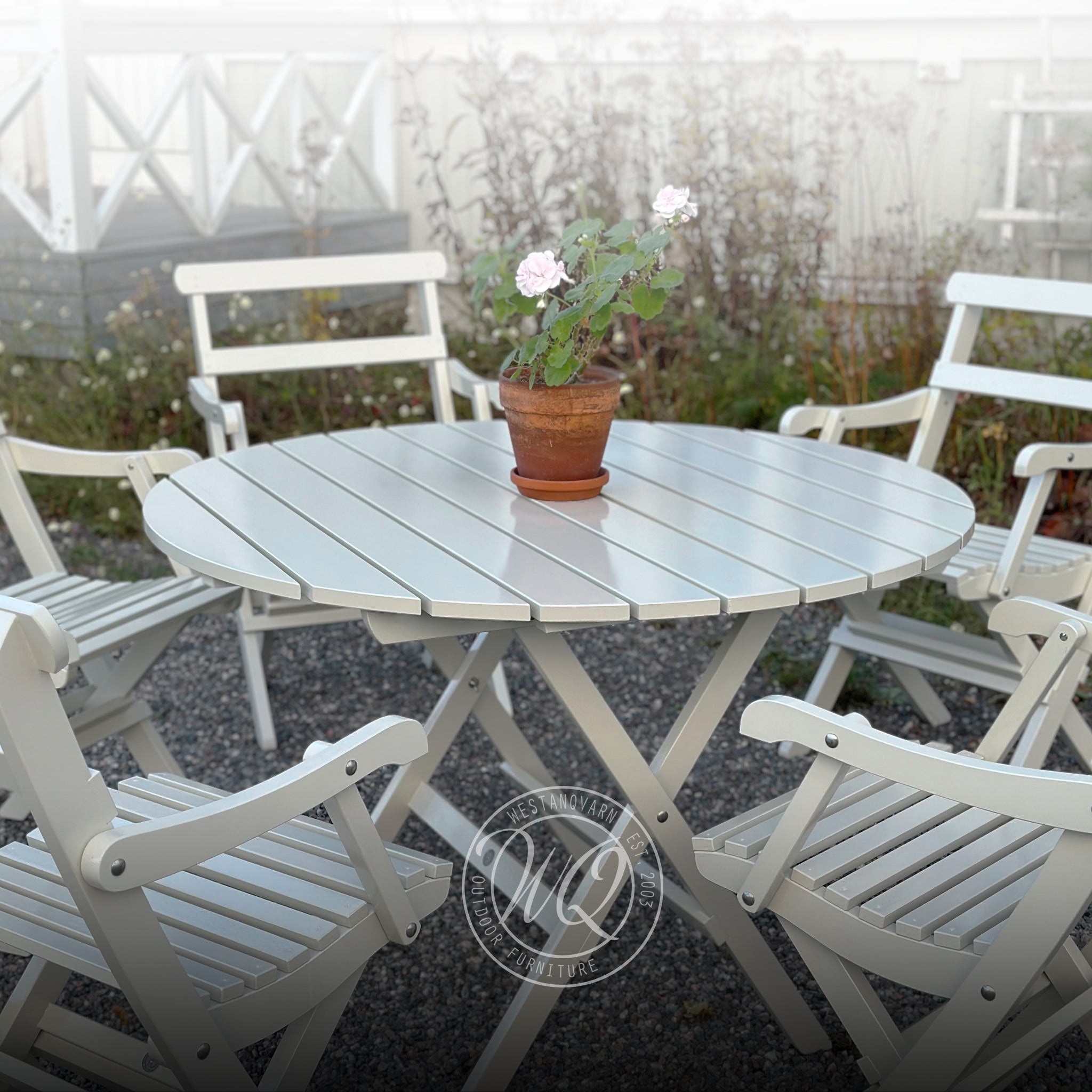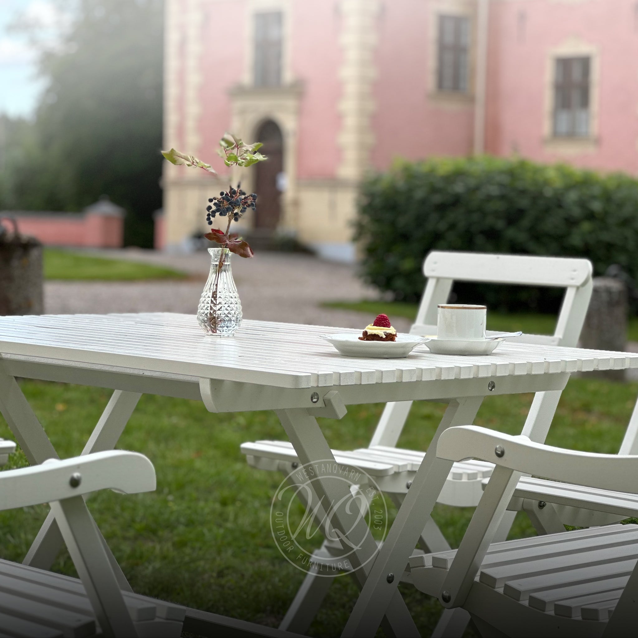 Solbacka är en högklassig utemöbelkollektion i klassicistisk 1920-tals anda. Den är närtillverkad av kvistfri tätvuxen kärnfuru av högsta kvalitet. Möblerna handmålas med äkta linoljefärg som andas och gör att de får en mycket lång livslängd och är enkla att underhålla. Formgivningen är ergonomiskt optimerad för hög sittkomfort. Hopfällbarheten underlättar transport och förvaring. Skruvar och bultar är i rostfritt/A4 stål. Läs mer om hur du underhåller dina utemöbler…